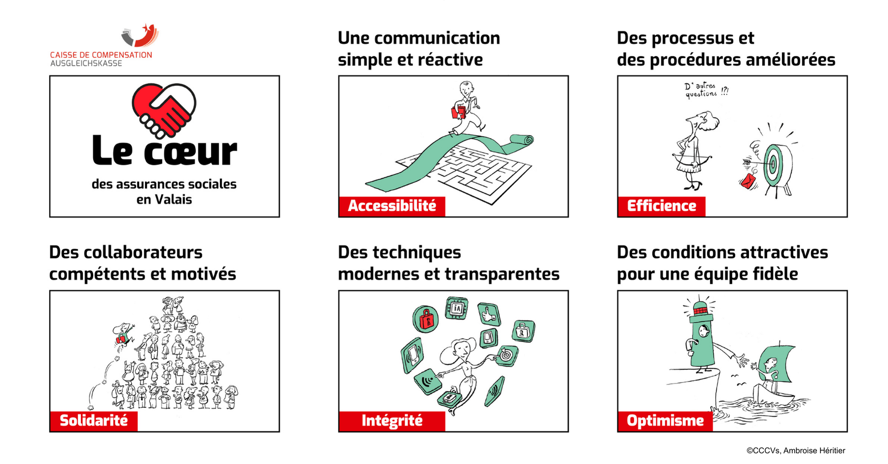 Cette simple phrase résume notre raison d'être, notre crédo. Nous voulons faire battre le cœur des assurances sociales, les rendre vivantes, faire en sorte qu'elles soient présentes et appréciées par l'ensemble de la population valaisanne. C'est pour nous un pilier de la société d'hier, d'aujourd'hui et de demain.